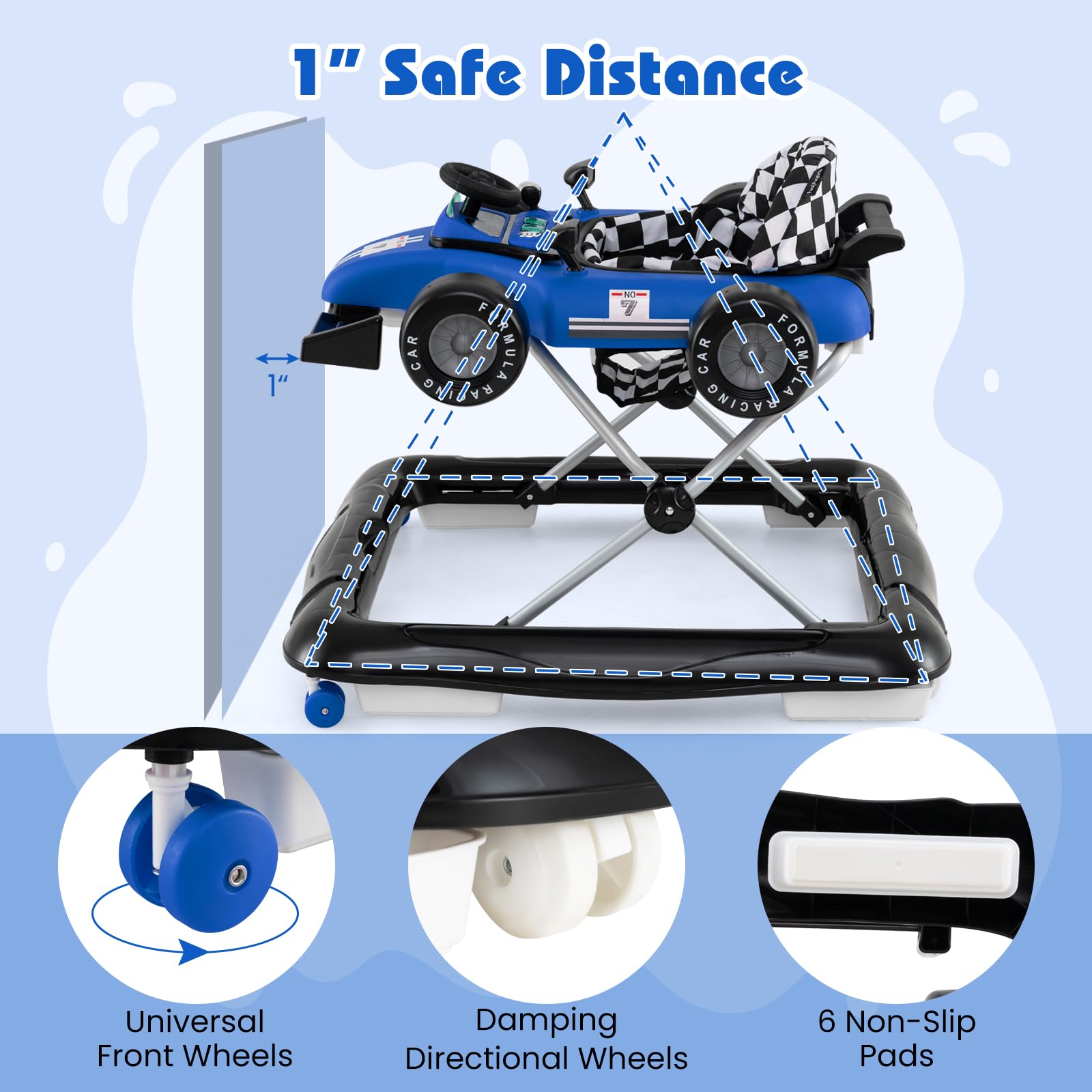 - ăSafety Comes Firstă The ASTM & CPSIA certificated baby walker features 6 anti-slip pads (auxiliary brakes) to eliminate the risk of falling down stairs or rolling down slopes. With a 2-inch gap reserved between the front of the walker and the wall, it prevents finger pinching for a safe world exploration. The enlarged base ensures a stable center of gravity and prevents tipping over. Moreover, the widened wheel spacing prevents foot bumping during walking process.