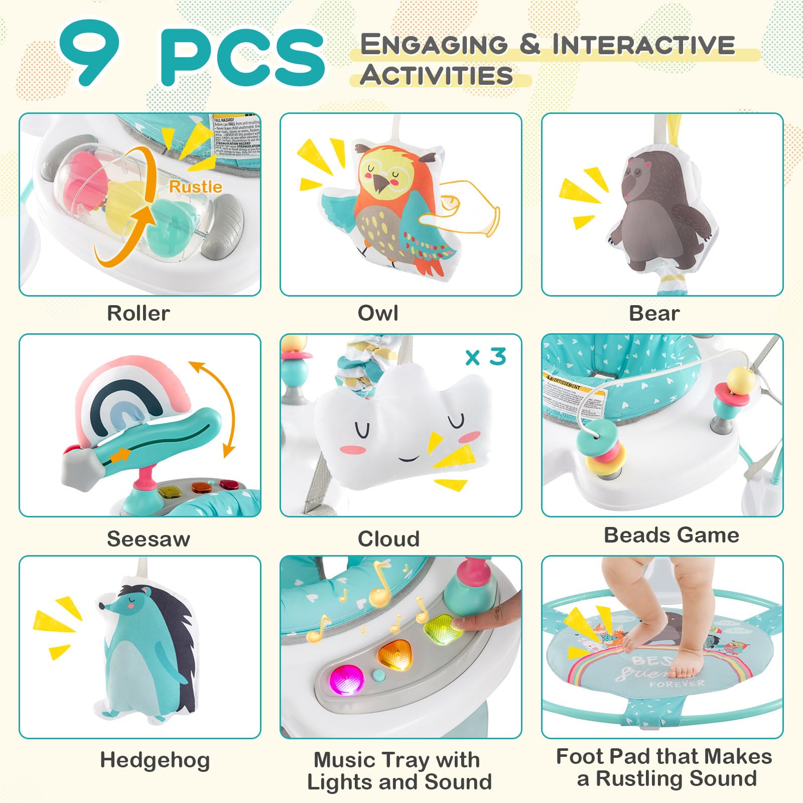 - Interactive Toys & Music Box: This baby jumper comes with 10 pcs engaging and interactive activities: a roller, an owl, a bear, a seesaw, 3 cloud-shaped toys, a beads game, a hedgehog, a music tray with lights and sound effect, a foot pad that makes a rustling sound. These toys can stimulate your baby's senses and promote cognitive development. Note: music tray requires 3 AAA batteries (not included).