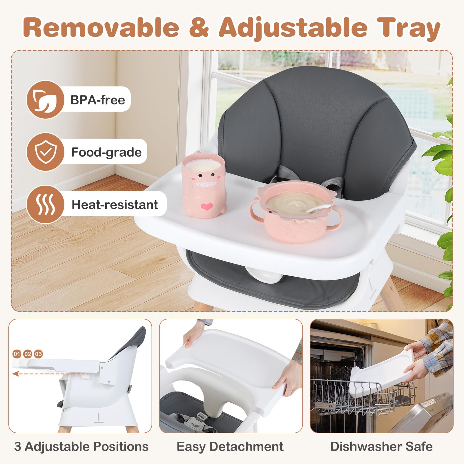 BABY JOY High Chair, Convertible Wooden Highchairs for Babies and Toddlers, Converts to Booster Seat & Stool with Adjustable Legs, Removable Tray, Safety Harness, Waterproof PU Cushion (Gray)