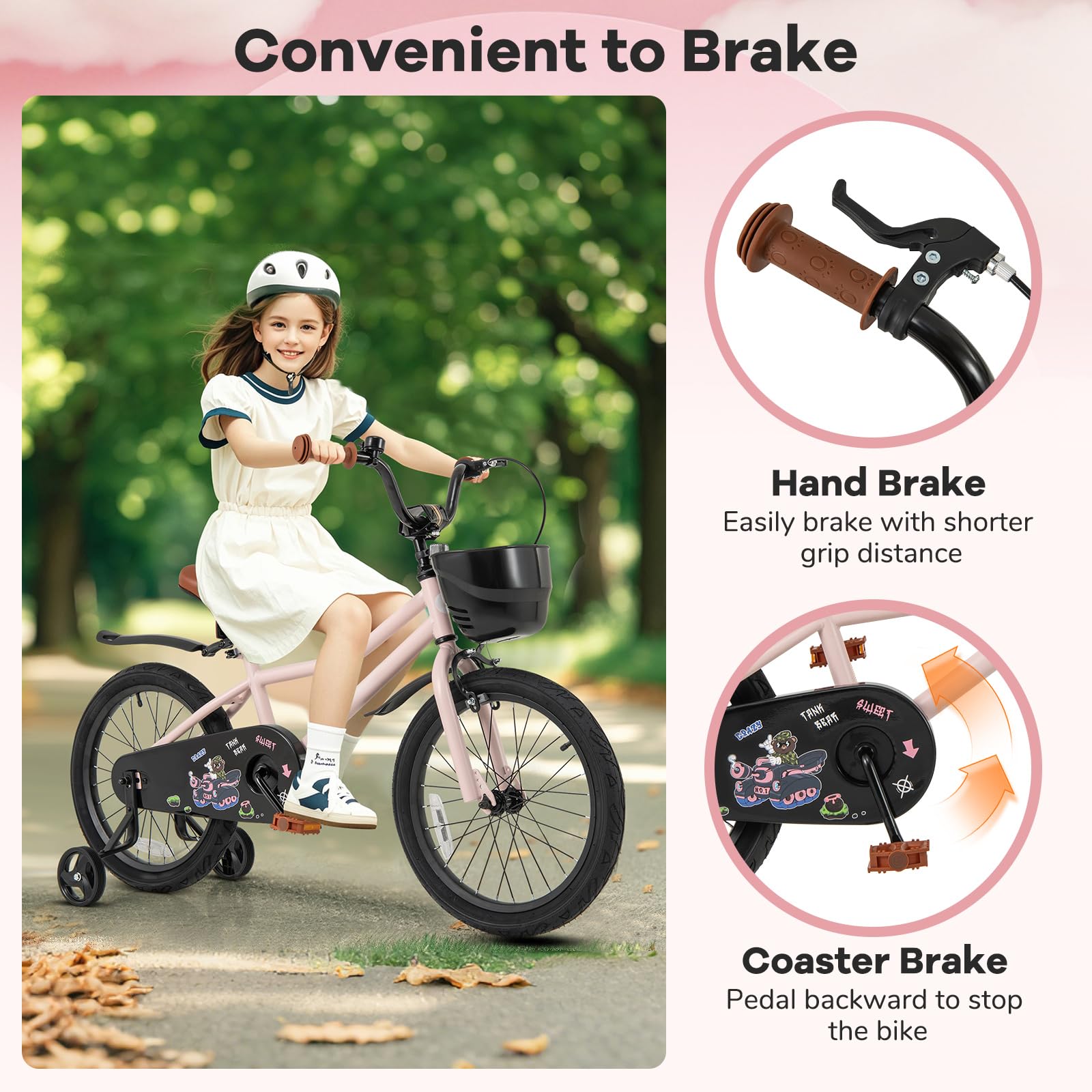 - Dual Brake System & Training Wheels: The training bicycle is equipped with dual brake system: hand brake for kids to easily brake with shorter grip distance and coaster brake to pedal backward to stop the bike. Fully enclosed chain guard prevents accidental clamping to ensure riding security. Plus, it also comes with 2 detachable training wheels for beginners to better keep balance.