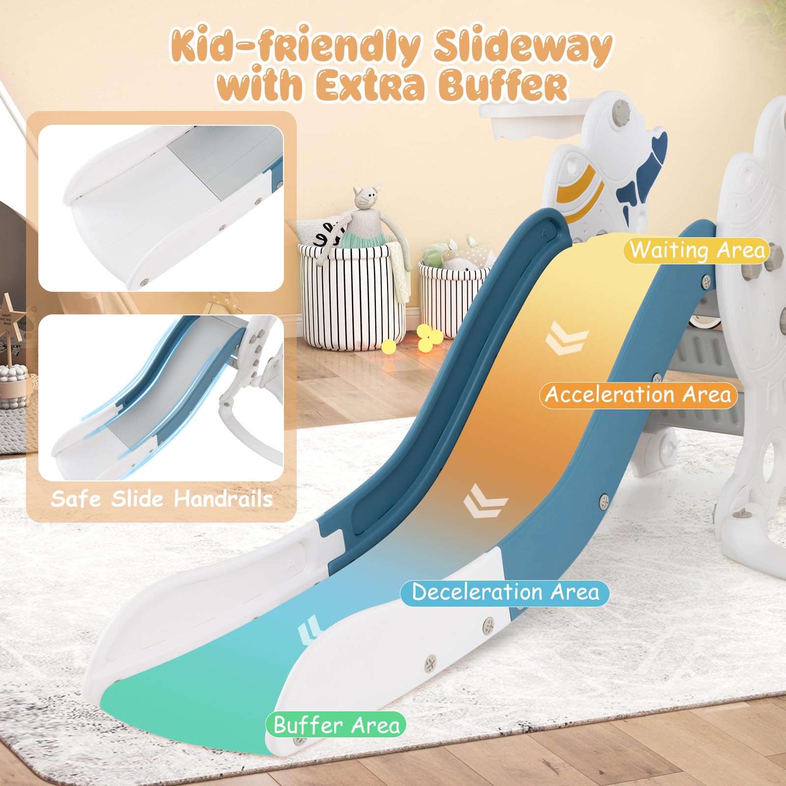 - 【4 in 1 Swing and Slide Set】 Kid slide is a versatile toddler playground, which includes climber, swing, slide, and basketball shooting feature, which offers a variety of activities to keep children engaged and entertained. It offers your little one aged 18+ months old different playing methods for entertainment, and exercises their motor skills and hand-feet coordination during their playtime.